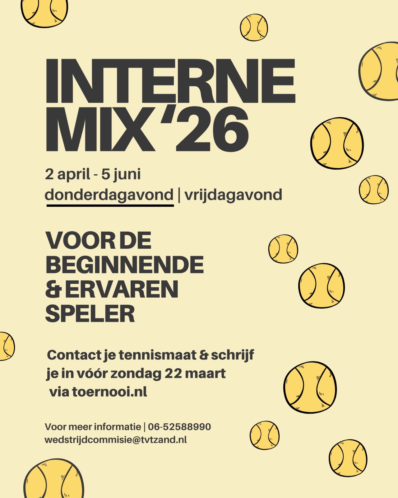 Voor informatie kunt u zich richten tot de wedstrijdcommissie. De toernooileider van de interne mix is Berry Scheerhoorn: bereikbaar op 0652588990 en via [email protected].