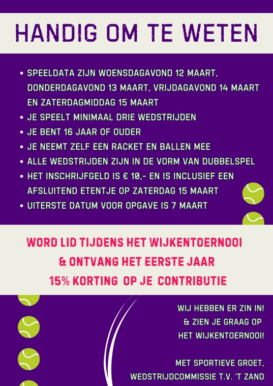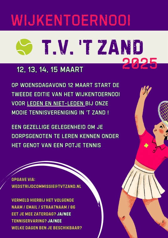 Op woensdagavond 12 maart start de tweede editie van het wijkentoernooi bij onze mooie tennisvereniging in ’t Zand! Een gezellige gelegenheid om je dorpsgenoten beter te leren kennen onder het genot van een potje tennis.